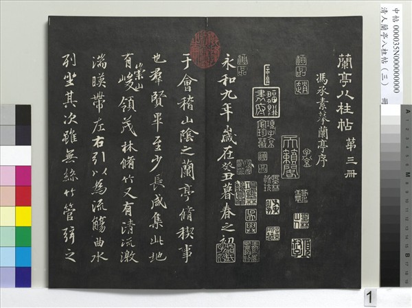 〈蘭亭八柱帖〉是清乾隆四十四年(西元一七七九年),高宗以內府所收〈虞世南〉、〈褚遂良〉、〈馮承素摹蘭亭〉,及柳公權〈蘭亭詩〉三種,董其昌臨柳書〈蘭亭詩〉和乾隆臨董其昌〈蘭亭詩〉八種摹勒上石並裝裱成冊,以八卦之名為次序,刻於八根柱石,原置於圓明園中。選展艮冊,為〈馮承素摹本〉,即神龍半印本,摹榻精良,頗能展現墨蹟筆法。(20110101)