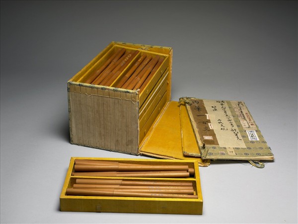 有蓋竹管筆一盒,身細長無筆管,竹桿自然本色,均未曾使用過。內中有稍大的羊毫筆與較小的兼毫筆,筆毫略如葫蘆形。竹筆管上刻填金楷字︰「天子萬年」,下署填藍楷字︰「臣白潢恭進」。本件共一百枝,分置五屜,共儲裱錦紙匣。