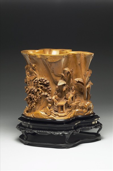 黃楊木樹幹為材,依其天然生成之型態,以通景式構圖雕刻傳米芾所作之〈西園雅集圖記〉中,蘇軾、黃庭堅、李公麟及米芾等十五位北宋著名文士於駙馬王詵的西園文會情景。善用材質且構思巧妙,使得整體空間錯落、層次分明;深刻淺雕溪水綠蔭、山石環境的自然景致;細膩刻鏤文士或談禪、或論道、或觀畫、或揮毫、或題壁的怡然情態。將後世所嚮往的文人聚會之經典,從文字記述轉化成為立體雕刻,在仿效自然的園林山水中,體現人與自然的最佳唱和。