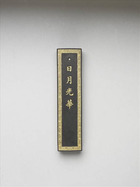 長方形墨,周起細棱,色黝黑細膩。一面模印漱金回紋方框,面上方鑲嵌一小珍珠,下金書「日月光華」,另一面佈滿漱金雲紋。有裱布與紙盒。