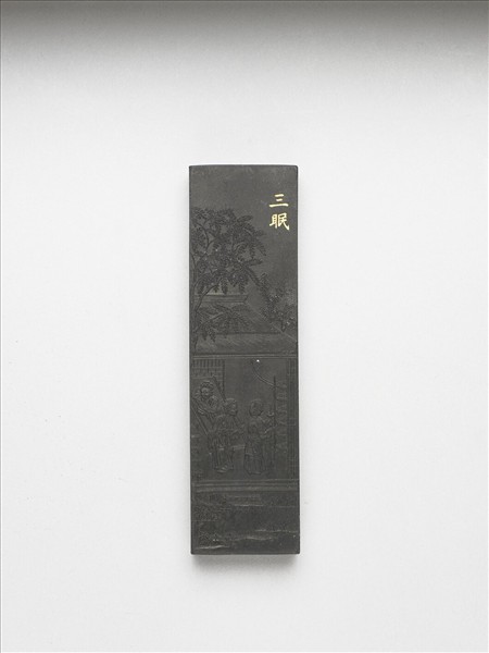 長方形墨。一面模印填金楷字「三眠」,並模印屋舍庭樹,屋內有三人,一人方眠,另秉燭者正回首與另一人對談,整圖應是表現養蠶者辛勤看顧蠶之生長期變化與發展。另一面漱金題:「御詩。淑景頻催喜載陽,微行步步採條桑,三眠三起新蠶老,篝火看時夜未央。」御製織圖詩墨一套二十三件,收於雙龍「御製耕織圖詩墨」漆提盒,並有錦盒與函套。
