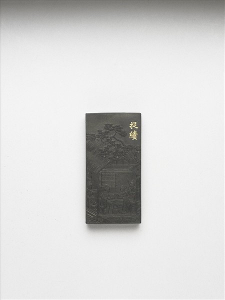 長方形墨。一面模印填金楷字「捉績」,並模印屋舍樹木為飾,屋中有四人,一人秉燭,婦女二人正事「捉績」。另一面漱金題:「御詩。蠶筐高下架頭分,食葉聲煩似雨聞,捉績欣看光練練,一家婦女共辛勤。」御製織圖詩墨一套二十三件,收於雙龍「御製耕織圖詩墨」漆提盒,並有錦盒與函套。