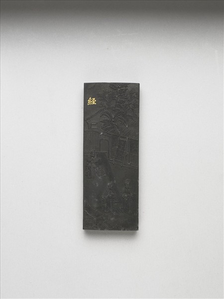 長方形墨。一面模印填金楷字「經」,並模印屋舍庭景,庭中有三人,作繃展絲線之像。另一面漱金題:「御詩。砌下風飄待女蘭,新絲經理欲成紈,安排頭緒分長短,約伴同來仔細看。」御製織圖詩墨一套二十三件,收於雙龍「御製耕織圖詩墨」漆提盒,並有錦盒與函套。