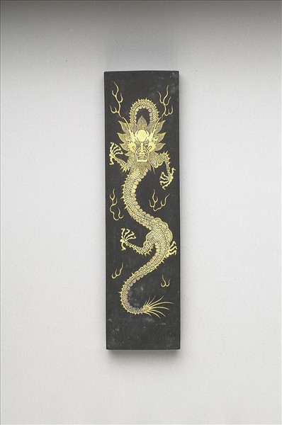 長方形墨。一面漱金折帶紋為邊框,中央直書陰文填金楷字「御製耕織圖詩」,上嵌一小珍珠,另一面為描金銀龍紋。御製耕圖詩墨一套二十四件,收於雙龍「御製耕織圖詩墨」漆提盒,並有錦盒與函套。