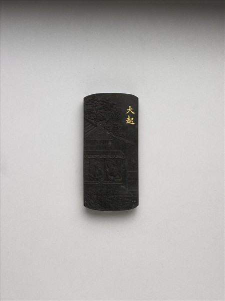 長方形墨,兩端略弧起。一面模印填金楷字「大起」,並模印屋舍庭樹,屋內有二人,一人提籃置於窗台,一人正忙於蠶事,似正應付著蠶隻蛻皮「大起」的繁忙。另一面漱金題:「御詩。春光荏苒去堂堂,無那黃鶯一日忙,箔上吳蠶方大起,氷絲色映綠筠筐。」御製織圖詩墨一套二十三件,收於雙龍「御製耕織圖詩墨」漆提盒,並有錦盒與函套。