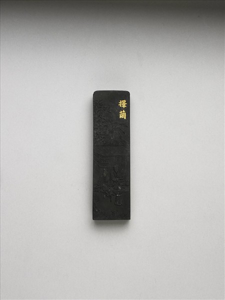 長方形墨,一端兩角圓弧。一面模印填金楷字「擇繭」,並模印屋舍庭景,庭中有一大桌,桌上有蠶繭,桌旁兩人正檢選蠶繭,一小兒於桌邊旁觀。另一面漱金題:「御詩。弱繭何時成綺紈,拮据冀免一身寒,八蠶獨蛹還須擇,几上分明取次觀。」御製織圖詩墨一套二十三件,收於雙龍「御製耕織圖詩墨」漆提盒,並有錦盒與函套。
