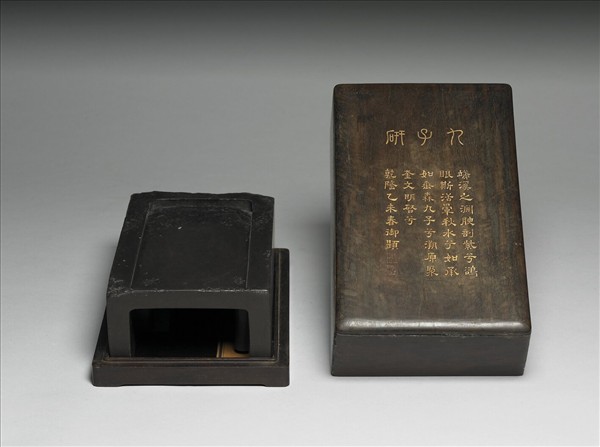端石,長方抄手式,硯背斜下,下端無堵,石色紫中泛紅,硯堂微窪平整,墨池斑駁處處,墨池深約一‧五公分,硯背有高低石柱九,參差其間,《西清硯譜》云為鴝鵒眼。硯背下方浮雕一葫蘆印:「子京」,二字篆書,硯壁右側鐫清高宗御題銘乙首,隸書:「端溪之淵腴剖紫兮,鵒眼斯活暈秋水兮,如承如重森九子兮,溯原聚奎文明啟兮。」,款題:「乾隆御題」,鈐印二:曰「比德」「朗潤」。