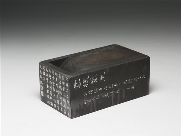 長方形端石硯,抄手式,色黑泛紫。硯池寬深接硯堂處作圓弧形,硯堂微凹有使用痕,全器光素無紋飾。側邊壁琢「雲根紫玉。宋時端石灰色為上,馬肝次之,即此是也,知之者鮮矣。吉璁」,首邊壁刻乾隆詩文及「古稀天子」「猶日孜孜」印。有刻同御製詩文黑漆硯盒附件。