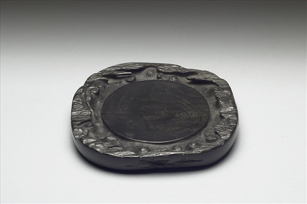 不規則圓形硯,略方,色黝黑鬱亮,夾棕色絲紋。面中央琢一正圓,拋光明亮,為硯堂。四周較高作岩山狀,往內深凹處為圓形硯池,雕多種波濤紋。有同形嵌螺鈿龍紋黑漆盒。