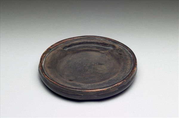 硯,圓形,色棕褐黝黑,硯面周緣起一圈棱,一端有璜形池,墨堂微圓凹。硯背鼎立三矮柱狀足,足間模印四行楷書硯銘,多字漫渙,押一篆書方印:「儒林之寶」。