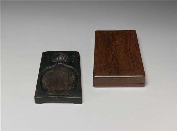 略呈梯形,上窄下寬,全器黑中泛澄泥的棕黃色,墨堂墨鏽甚深。硯面呈括囊形,較窄端囊口呈五瓣花狀如意雲首形,是為墨池;頸部束一窄橫樑,下鑿有一孔,以連通墨堂與墨池;囊身寬圓,墨堂凹弧,周緣斜下。硯背窄端兩隅各有一L形足,較寬的一端兩隅則為方形足,四邊緣斜弧。囊口墨池兩側陰刻楷書年號款。硯背陰刻雙行篆書銘。