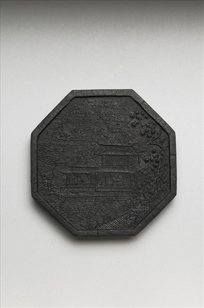 八角形墨,邊框起棱。一面有填金楷字「御墨」、「乾隆辛卯年製」(1771),並模鈐填金「凌煙閣」三字。一面有模印宮殿居中,雲霧圍繞,此宮殿建築圖像,應即「凌煙閣」圖式。此墨與其他五十一墨同儲於兩屜一匣中。