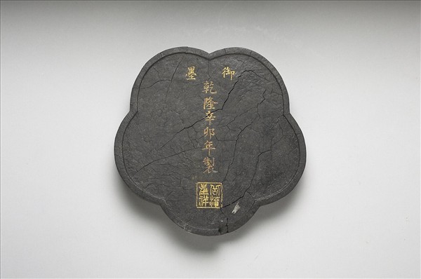 五瓣花形墨,邊框起棱。一面模印「御墨」、「乾隆辛卯年製」(1771)楷字,並模鈐「岳瀆呈祥」四字,墨面上之字樣均有填金以為飾。一面模印山岳景色,一山居中而四面環水,四角又各有一山圍伺,各山之上均見屋宇。此墨與其他五十一墨同儲於兩屜一匣中。