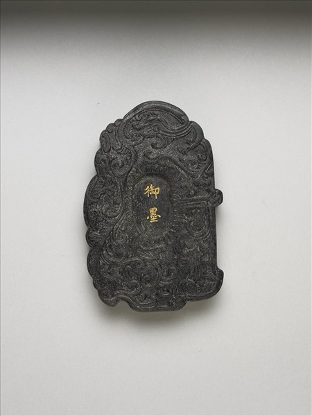 黑墨,外廓為近卵形之不規則狀,兩面皆模印一龍飛繞於雲間,墨面中央有一橢圓形開光,開光中文字兩面有異,一面為填金楷字「御墨」,另面為填金楷字「乾隆辛卯年製」(1771),並模鈐「夔○玦」二字。惟除龍首外,龍身紋多變形而與雲紋無別,尾部則近蕉葉之形。