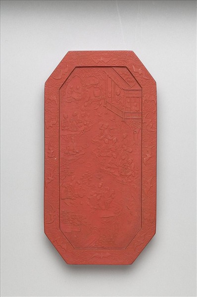 長方形硃墨,四角截去而呈八角形,邊框起棱,棱面模印雲紋與蝙蝠紋。一面填金楷字「御墨」、「乾隆辛卯年製」(1771)款識,並模鈐填金「蘭亭修禊」四字。一面模印蘭亭修禊圖像,人物眾多,三三兩兩,聚坐於流水旁,或相對討論,或張紙執筆,或正勾取水中之流觴,正是王羲之《蘭亭集序》一文所描寫的圖像。