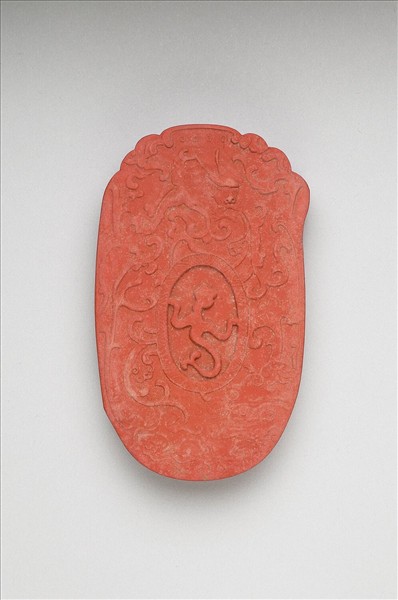 橢圓形硃墨而類玉佩之形。兩面皆模印一龍飛繞於雲間,墨面中央有一橢圓形開光,開光中皆有一小龍子。墨側模鈐「○○○」,並有「御墨」楷字及「乾隆辛卯年製」(1771)楷款。