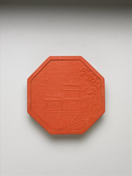 八角形硃墨,邊框起棱。一面有填金楷字「御墨」、「乾隆辛卯年製」(1771),並模鈐填金「凌煙閣」三字。一面有模印宮殿居中,雲霧圍繞,此宮殿建築圖像,應即「凌煙閣」圖式。