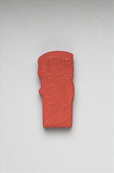 圓首碑碣形硃墨。墨之兩面均以卍字紋為地,上有一龍,惟龍身簡省離散一如雲狀紋,墨面下方模印蕉葉為飾。墨側有「乾隆辛卯年製」(1771)、「御墨」填金款識,並模鈐「雜佩」二字。