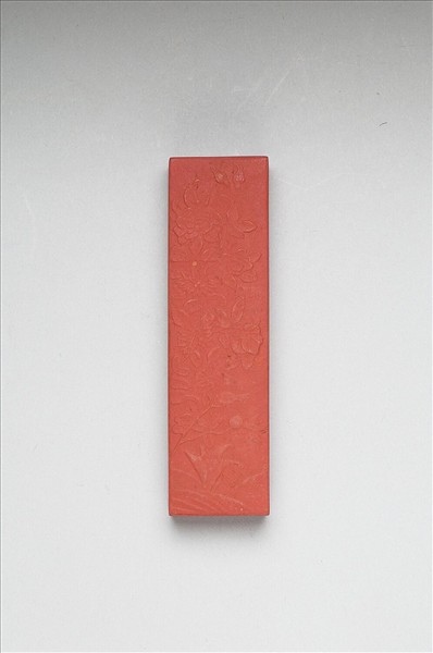 長方形條狀硃墨。一面模印填金「御墨」、「乾隆辛卯年製」(1771)字樣,並模鈐填金「曉豔寒香」四字。另面則模印花卉數株,花朵盛開而葉片繁茂。