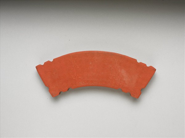 璜形硃墨,外廓有半圓形凹入,邊框起棱。墨之兩面均以回紋為地,並模印類如意、雲頭之花紋為飾。墨之側有「乾隆辛卯年製」(1771)、「御墨」填金款識,並模鈐「蒼缶佩」。