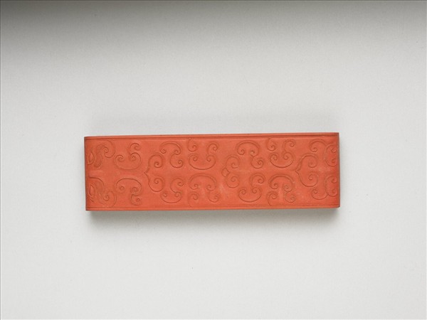 璏形硃墨,整器全仿玉璏之形制。面上滿飾卷雲紋。背面填金模鈐「天府永寶」、「古香」,並有「大清乾隆年製」、「樂壽堂珍藏」填金楷款。