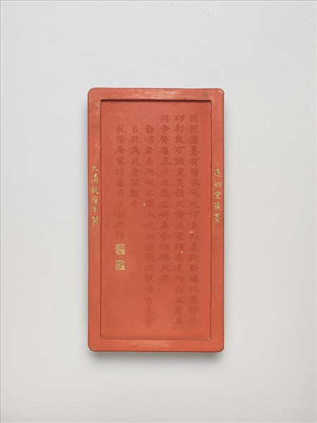 長方形硃墨,邊框起棱,棱面與墨側均模印圖案化龍紋為飾,整墨如一硯形。一面模印雙龍相戲於大海波濤,龍身漱金。一面模印乾隆御製詩文,概述此墨形制之由來,乃仿之於劉源所造者,另此墨面棱上有「大清乾隆年製」、「遂初堂藏墨」填金楷款。