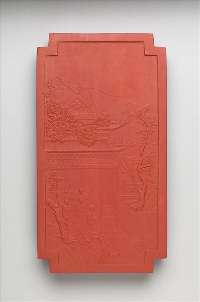 長方亞形硃墨,邊框起棱。一面模印填金楷字:「御墨」、「乾隆辛卯年製」(1771),並模鈐「世掌絲綸」四字。一面則模印屋舍園景,屋內有女子正作穿針引線之勢。
