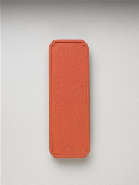 長方形硃墨,四角內凹,邊框起棱,棱面以六角形紋為飾。一面有填金楷字「御墨」、「乾隆辛卯年製」(1771),並模鈐「黑丹」。另面則模印山水景色為飾。