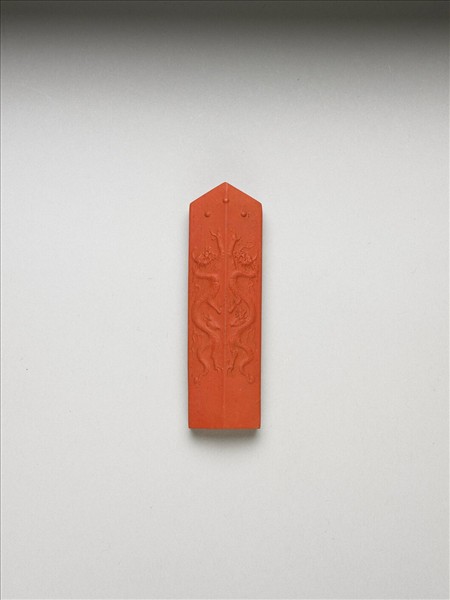 尖首圭形硃墨。一面模印雙龍紋與龍珠為飾,墨面中央有一直線突起如鑄範線,雙龍以此為界,各據一側。另面有填金隸字「青圭」並模鈐「御墨」。墨側則有「康熙辛未年製」(1691)楷款。