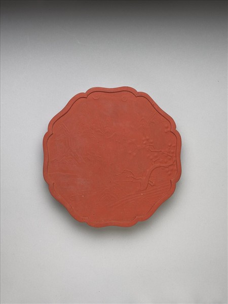 八邊形硃墨,每邊皆內弧,使整墨外廓如花瓣之形,邊框起棱。一面有填金楷字「御墨」、「乾隆辛卯年製」(1771),並模鈐填金「天保九如」四字,而另面所繪之山川日月圖像,即「天保九如」圖式。