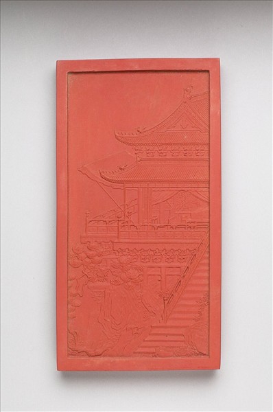 長方形硃墨,邊框起棱。一面模印填金「御墨」隸字與「綸閣」篆字,並模鈐「子子孫孫用之協相」。一面則為臺閣樓景,建築內可見桌案,案上有書冊多疊,由於「綸閣」是天子綸旨制誥的起案處,故此面圖式應該是表現「綸閣」者。墨側有「乾隆丙申年製」(1776)楷款。