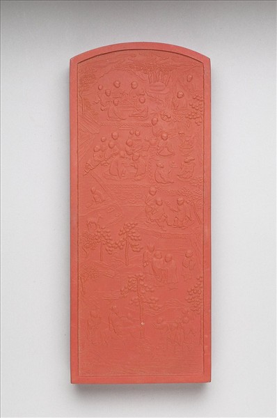 長方形硃墨,一端略弧,邊框起棱。一面有「乾隆辛卯年製」(1771)、「御墨」填金楷款,並模鈐「東林蓮社」四字。另面模印東林蓮社故實圖像,畫面繁麗精美,樹石人物幾乎滿佔墨面。