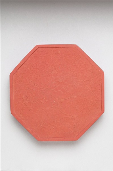 八邊形硃墨,邊框起棱。一面模印填金楷字「御墨」、「乾隆辛卯年製」(1771),並模鈐「眾香國」。另面則滿飾植物草木,花葉繁茂而多結實,其中多種花卉開花其間,應即描寫另面所稱「眾香國」之意。