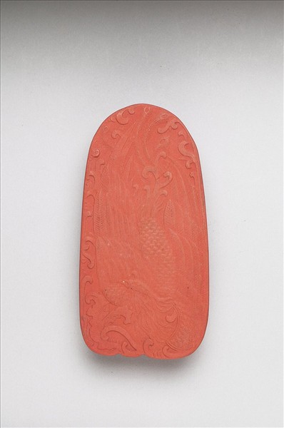 卵形硃墨,墨面均模印一鳳飛舞於雲間為飾,其中雲氣均在墨面邊緣,鳳則佔據整個墨面,張翅回首,表現其飛動之勢。墨側則有填金楷字「乾隆辛卯年製」(1771),並模鈐「鳳佩」二字。