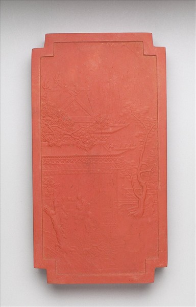 長方亞形硃墨,邊框起棱。一面模印填金楷字:「御墨」、「乾隆辛卯年製」(1771),並模鈐「世掌絲綸」四字。一面則模印屋舍園景,屋內有女子正作穿針引線之勢。