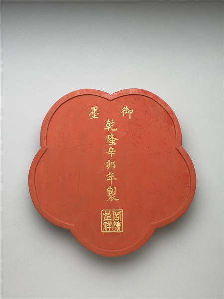 五瓣花形硃墨,邊框起棱。一面模印「御墨」、「乾隆辛卯年製」(1771)楷字,並模鈐「岳瀆呈祥」四字,墨面上之字樣均有填金以為飾。一面模印山岳景色,一山居中而四面環水,四角又各有一山圍伺,各山之上均見屋宇。