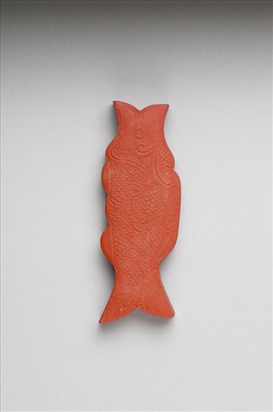 魚形硃墨,邊框起棱,兩面皆依魚之部位模印相應紋飾,使整墨一如張嘴之魚形。墨側填金模鈐「御墨」、「乾隆辛卯年製」(1771)填金款字,並模鈐有「魚佩」二字。