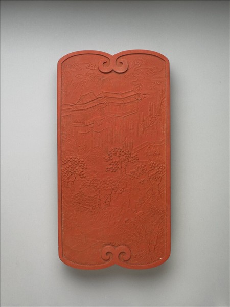 長方形硃墨,四角圓弧,邊框起棱,邊稜於墨面首尾皆交接為一雲狀紋。一面填金楷字「乾隆辛卯年製」(1771)、「御墨」款識,並模鈐填金「仙居臺閣」四字。一面模印山水樓閣景觀,山間樓閣偉麗,雲霧環繞如在仙境,樓前有人聚坐奕棋,墨面左下一人正過橋前行,或即欲入山訪道者。