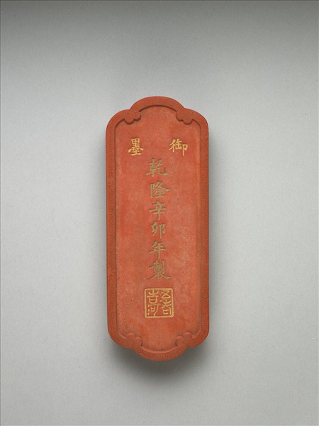 長方形硃墨,首尾兩邊有弧狀凸起,使外廓一如碑碣之形,邊框起棱,棱面滿飾雲紋。一面有填金「御墨」、「乾隆辛卯年製」(1771),並模鈐「五老告河」五字。另面模印七人聚集於水邊,正相互交談,當即描寫堯舜同遊,後遇五老於水邊的故事。