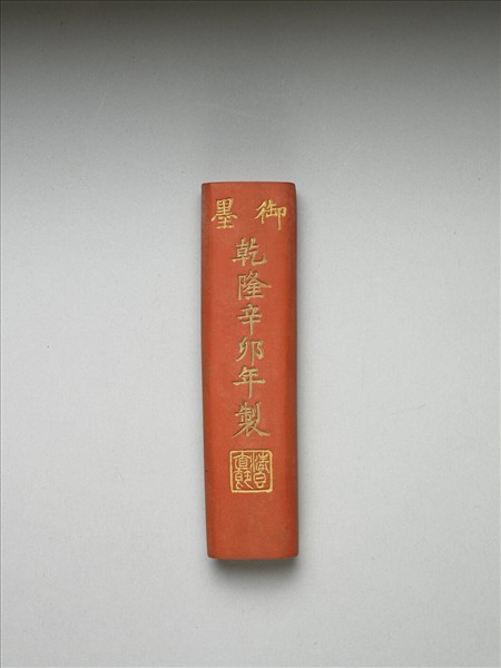 長條形硃墨。一面有填金楷字「乾隆辛卯年製」(1771)、「御墨」款識,並模鈐填金「清香直節」四字。一面模印梅花竹葉,花正盛開,又有小鳥兩隻躍飛其間,就中梅竹之象,即喻指「清香」、「直節」之意。此墨與其他三十五墨同儲於一錦屜。