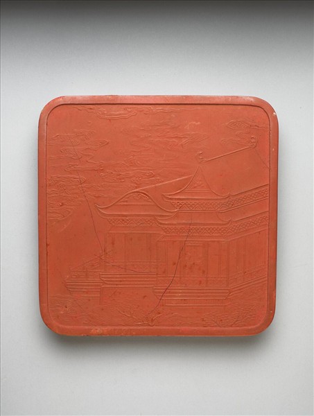 四方形硃墨,四角圓弧,邊框起棱,一面填金楷字「御墨」、「乾隆辛卯年製」(1771),並模鈐「青藜閣」三字。另面則模印樓閣四圍皆繞雲氣之景,閣中有二人,其中之一為拄杖老者。此墨與其他三十五墨同儲於一錦屜。