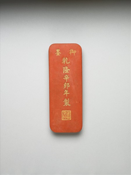 長方形硃墨,四角圓弧。一面填金模印填金:「乾隆辛卯年製」(1771)、「御墨」,並模鈐填金:「五色鳳凰池」五字。一面模印一城牆,牆有開口,水由其中流出,城牆上方有一鳳飛舞於雲間,另面「五色鳳凰池」所指當即此圖像。此墨與其他三十五墨同儲於一錦屜。