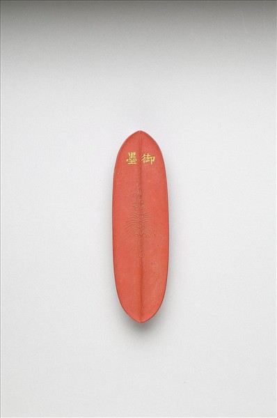 葉形硃墨,形近牛舌。一面之中棱線兩側有雲氣紋,並有填金楷字「御墨」。另面有「長春園精造」、「大清乾隆年」楷款,並帶填金「內殿輕煤」四楷字。此墨與其他三十五墨同儲於一錦屜。