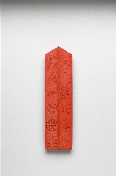 尖首圭形硃墨。一面邊框起棱,墨面中有填金「有虞十二章」隸字,題銘之上下方分別模印雲紋與波濤紋為飾。另面則模印有虞十二章圖像。墨側有「大清乾隆年製」、「古華軒珍藏」楷款。此墨與其他三十五墨同儲於一錦屜。