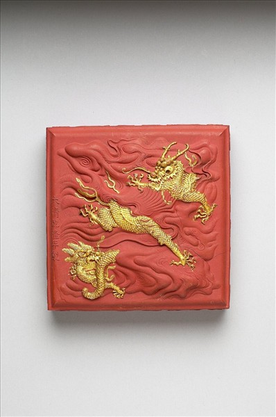 正方形硃墨,墨側以雲狀化之龍紋為飾。一面模印兩龍飛騰於雲間,龍身皆塗飾金彩,上有「大清乾隆年製」楷款。另面則模印「雲行雨施,萬國咸寧」八大篆字,排列佈局一如印面之形。此墨與其他三十五墨同儲於一錦屜。
