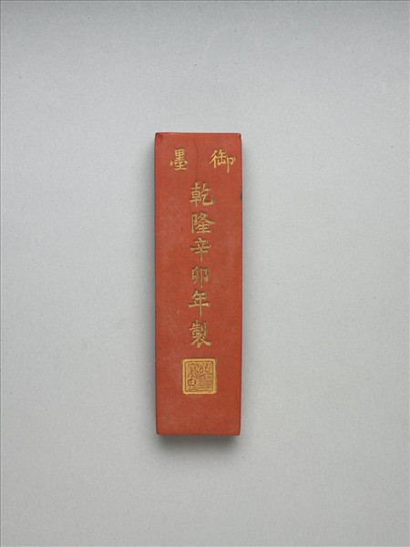 長方形條狀硃墨。一面模印填金「御墨」、「乾隆辛卯年製」(1771)字樣,並模鈐填金「曉豔寒香」四字。另面則模印花卉數株,花朵盛開而葉片繁茂。