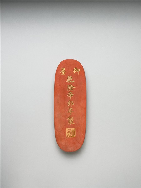 牛舌式長形硃墨。一面有填金楷字「乾隆辛卯年製」(1771)、「御墨」款識,並模鈐填金「映云日凌」四字。一面模印花葉茂盛之象,左方復有竹子直起。葉片生長亦然繁茂,使墨面裝飾熱鬧而有活力。