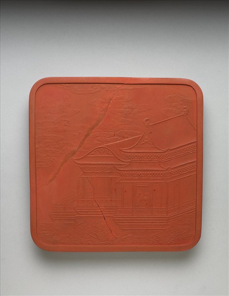 四方形硃墨,四角圓弧,邊框起棱,一面填金楷字「御墨」、「乾隆辛卯年製」(1771),並模鈐「青藜閣」五字。另面則模印樓閣四圍皆繞雲氣之景,閣中有二人,其中之一為拄杖老者。