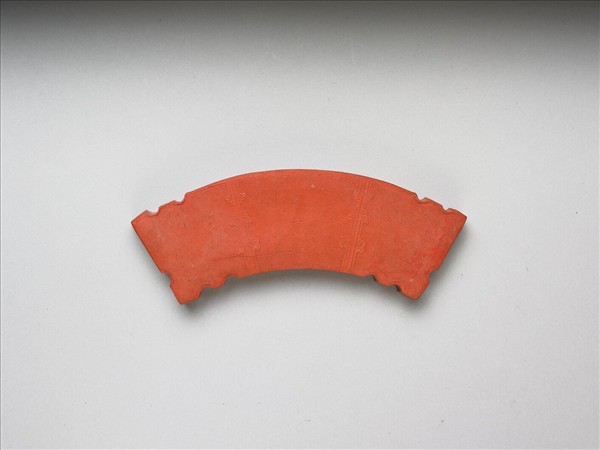 璜形硃墨,外廓有半圓形凹入,邊框起棱。墨之兩面均以回紋為地,並模印類如意、雲頭之花紋為飾。墨之側有「乾隆辛卯年製」(1771)、「御墨」填金款識,並模鈐「○佩」。
