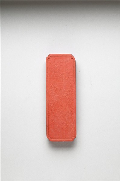 長方形硃墨,四角內凹,邊框起棱,棱面以六角形紋為飾。一面有填金楷字「御墨」、「乾隆辛卯年製」(1771),並模鈐「黑丹」。另面則模印山水景色為飾。